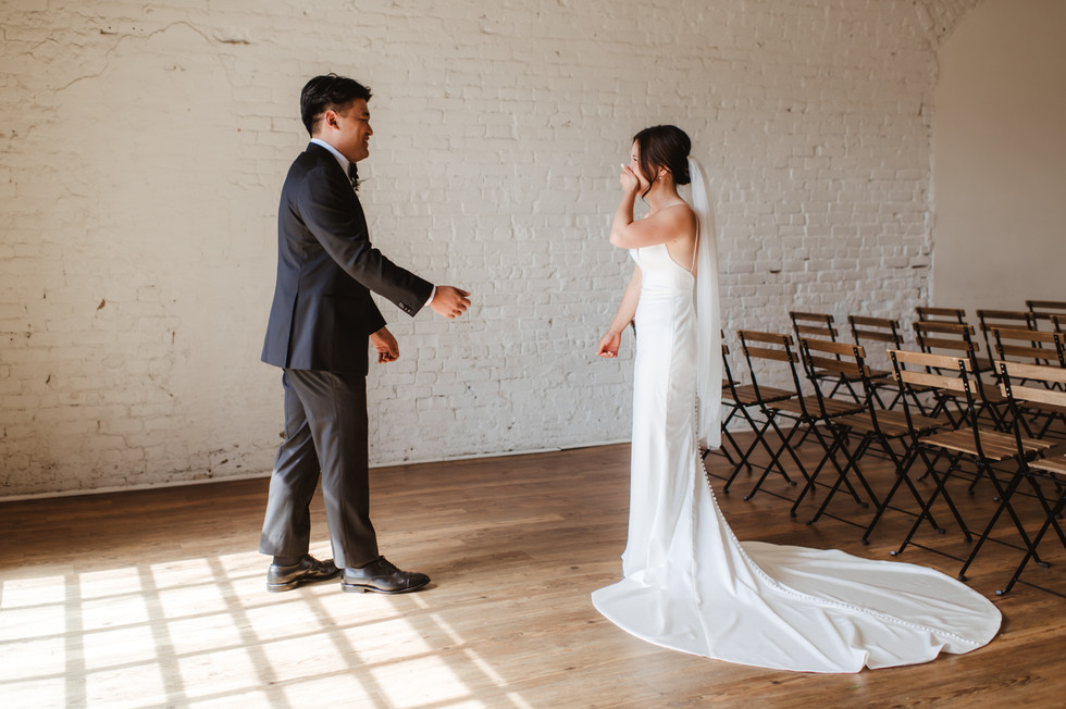 Their wedding took place in late spring, with a color palette that was effortlessly elegant: soft hues of dusty blue, gentle greens, and clean whites. One Eleven East, with its signature white brick walls, tall windows, and urban loft charm, provided the perfect blank canvas for their vision. The natural light flooding in made everything glow—from the florals to the couple themselves.
